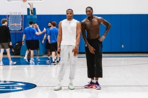 体育资讯9月12日讯 今日威少再次回到母校UCLA训练,现在效力于UCLA小埃里克-戴利更新IG晒出了与威少的训练照。