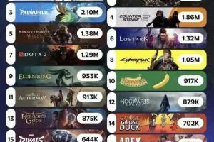 Steam游戏同时在线玩家榜:《绝地求生》325w,《黑神话》241w