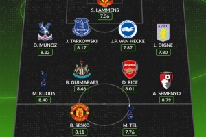 中场:库杜斯(热刺)、吉马良斯(纽卡)、赖斯(阿森纳)、塞梅尼奥(伯恩茅斯)