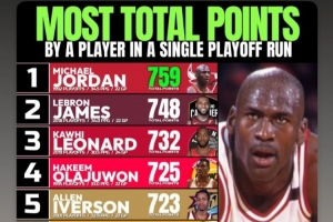 奥尼尔晒单次季后赛总分:92乔丹759分第1 18詹第2 19卡第3 SGA第9