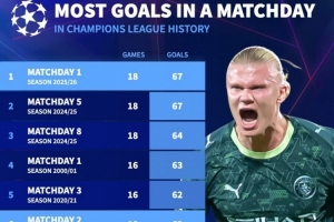 欧冠比赛日进球榜:本赛季首轮、上赛季第五轮67球并列居首