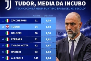图多尔带队场均1.58分,是21世纪场均积分并列第二少的尤文教练