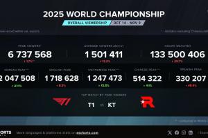 体育资讯11月9日讯 外媒统计T1对战KT海外峰值勘误更新为674万,比去年T1对战BLG的决赛下降1.7%。