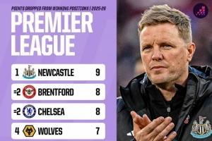 本赛季英超领先之后丢分榜:纽卡9分最多,小蜜蜂、切尔西8分
