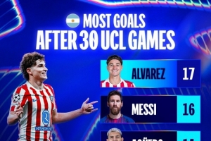 阿根廷球员前30场欧冠进球榜:小蜘蛛17球居首,梅西16球次席