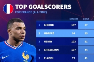 还差2球!法国队史射手榜:吉鲁57球居首,姆巴佩55球次席