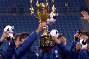 颁奖仪式:韩国队举起本届熊猫杯奖杯 中国队收获亚军银盘