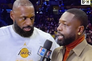 体育资讯12月2日讯 在上周六湖人对阵独行侠的比赛中,韦德现身场边采访詹姆斯。