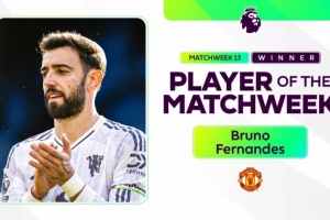 体育资讯12月2日讯 英超官方消息,曼联中场B费当选第13轮英超的最佳球员。