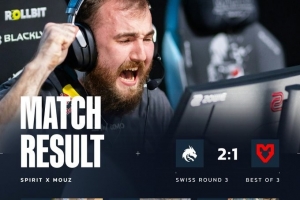 随后双方比分交替上升,第21回合sh1ro+donk联手三杀守住A点,次回合MOUZ搏命打B点下包,xertion1v3双杀被tN1R水下补枪得手,Spirit拿到赛点。尽管torzsi一打二赢下残局为MOUZ追回一个赛点,但sh1ro关键A大双杀配合tN1R双人四杀,Spirit13-11拿下图三,大比分2-1战胜MOUZ,Spirit瑞士轮三连胜晋级淘汰赛,MOUZ进入2-1组。
