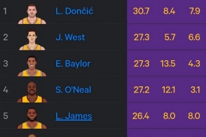 湖人生涯场均得分榜:东契奇30.7暂列第1 奥尼尔4 詹姆斯5 科比6