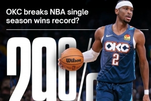 赛后预测机构Polymarket更新了雷霆打破73胜常规赛胜场纪录的概率——29%。
