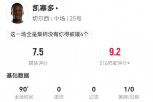 凯塞多本场数据:3抢断5拦截+9成功对抗 3犯规4造犯规 获评7.5分