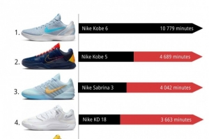 体育资讯1月2日讯 球鞋媒体kixstats统计了12月份NBA球员上脚球鞋的总时长排行,其中科比的两款球鞋排名前二,Kobe 6依旧是断档第一。WNBA球星约内斯库的Sabrina 3排名第三。