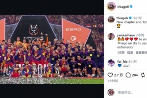 目前担任巴萨助教的蒂亚戈更新社媒动态,晒出球队捧杯的大合照,庆祝球队夺冠,配文:“新的篇章,本赛季首冠。”