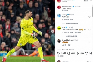 曼城门将多纳鲁马补时阶段做出关键扑救,帮助球队取胜,赛后他在社交媒体上晒出庆祝胜利的照片,配文:“太棒了!”