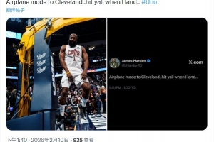 将迎克城首秀!哈登发推:飞行模式前往克利夫兰 落地后联系