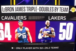 骑士64次+湖人50次!詹姆斯在两支球队拿到50次三双 历史唯一
