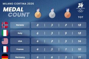 体育资讯02月14日讯 米兰冬奥会第7个比赛日战罢,中国队仍2银2铜,排名跌至第18,挪威8金3银7铜、东道主意大利6金3银9铜、美国4金7银3铜仍居前三。