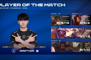 Raptor四局合砍10/9/44的战绩,拿下BFX对阵T1系列赛MVP
