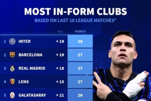前10联赛近10轮拿分榜:国米28分居首,巴萨、皇马、朗斯27分