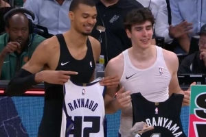 赛后,国王中锋雷诺和好友文班亚马交换球衣。