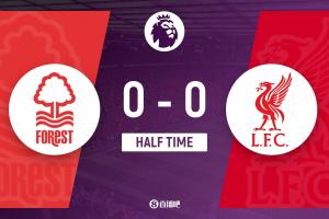 上半场伤停补时3分钟,半场结束,利物浦暂0-0诺丁汉森林。