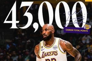 截至发稿时,詹姆斯已经得到16分,NBA生涯常规赛总得分突破43000大关,再创历史纪录!