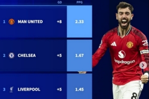 1、曼联 2.33分,净胜球+8