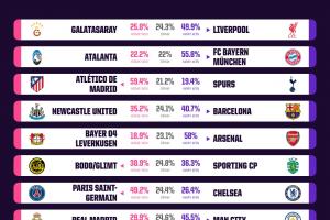 欧冠1/8决赛首回合预测胜率