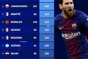 德转列欧冠每进1球用时排行:梅西105分钟第1,莱万、姆巴佩前三